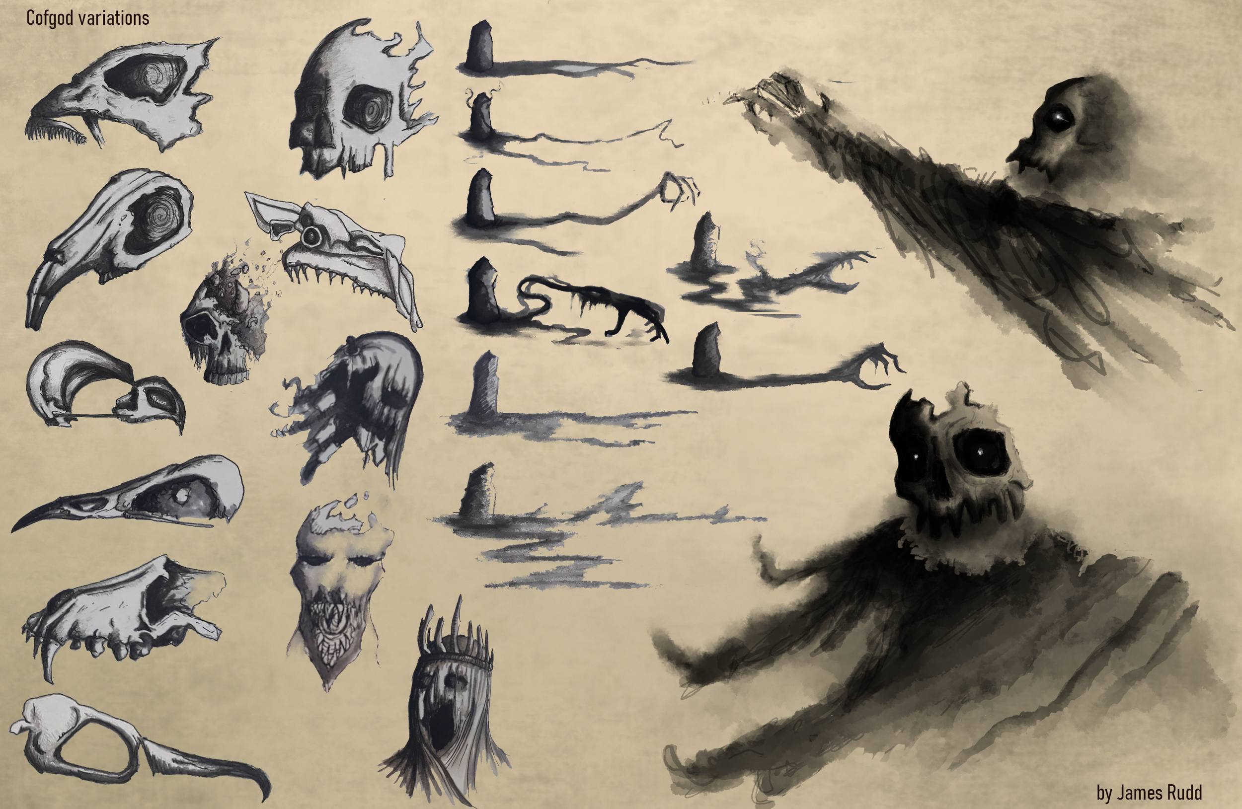 Concept art showcasing the corrupted Cofgod in its environment and with its totem.